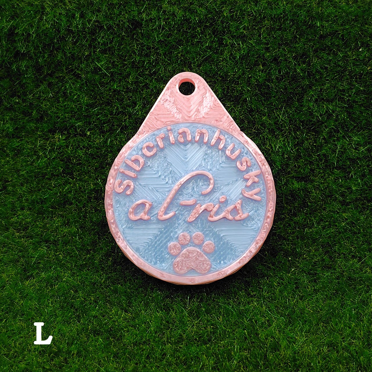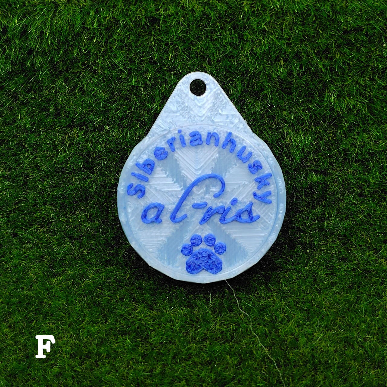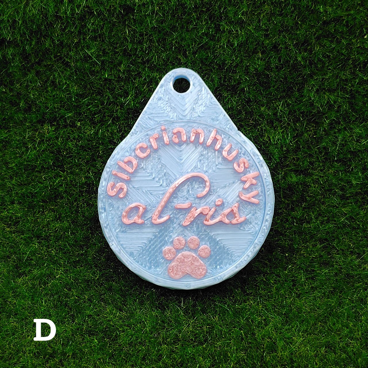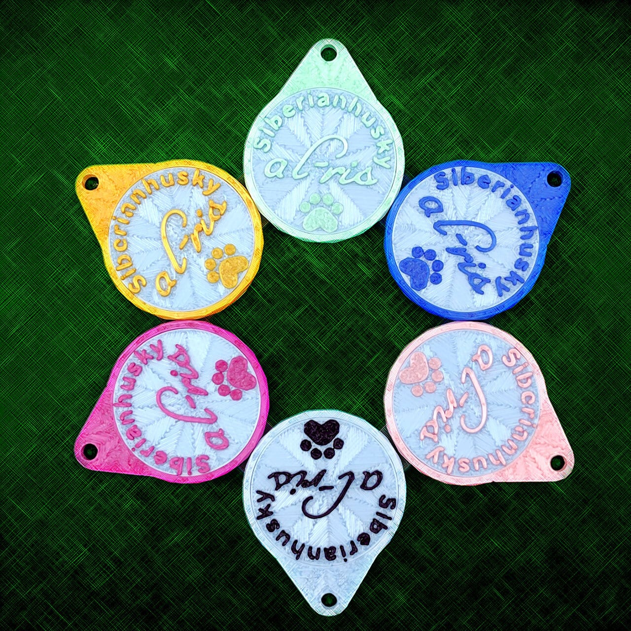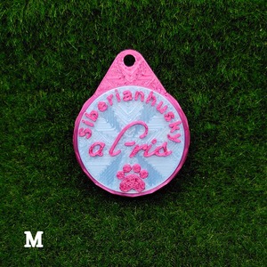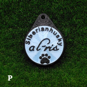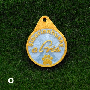 表面に犬種・おなまえ・足跡マーク、裏面にオーナー名・連絡先などが入ります。