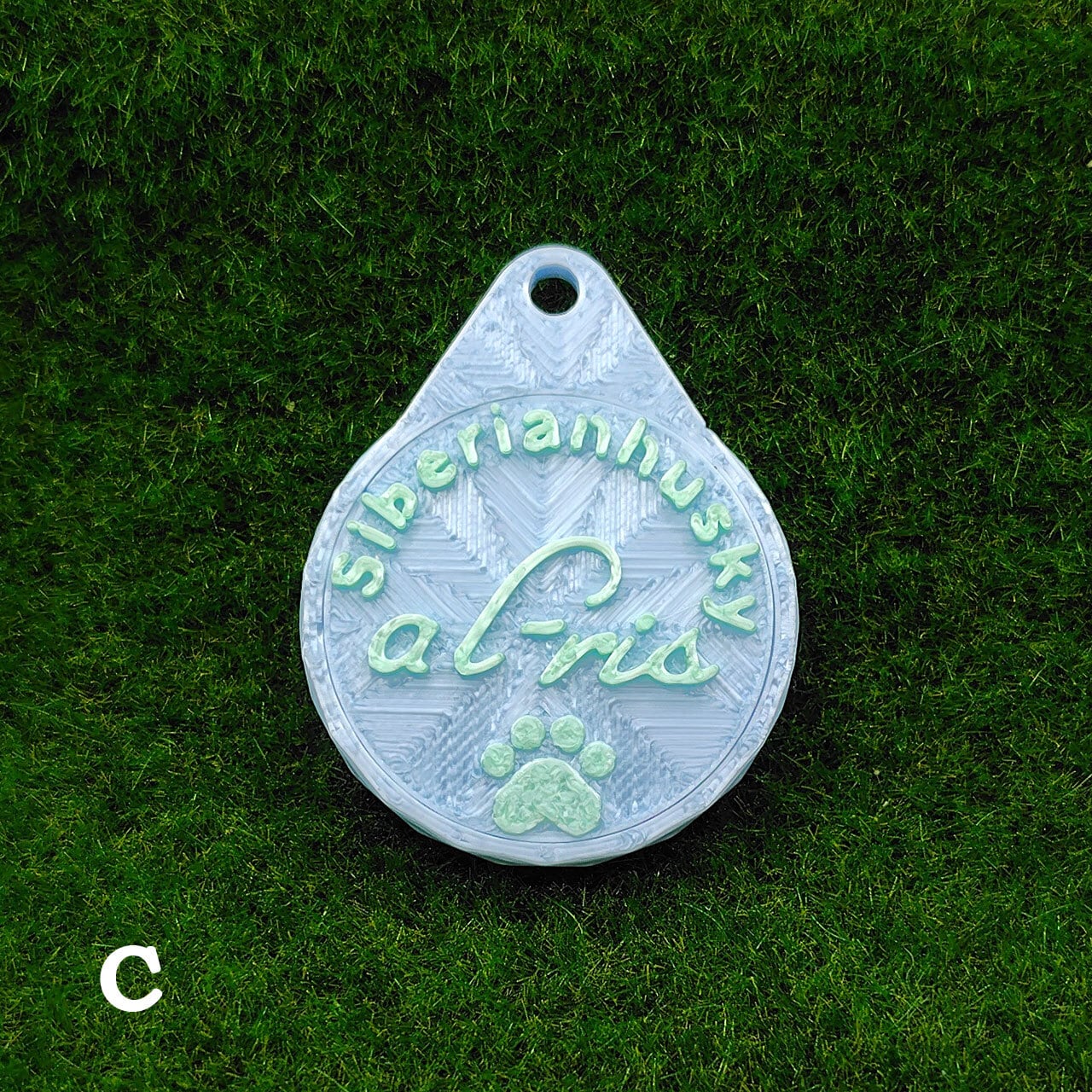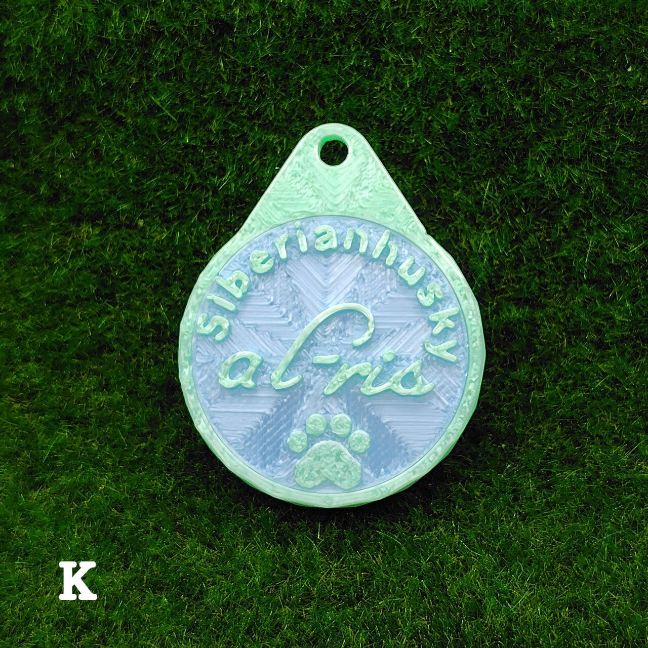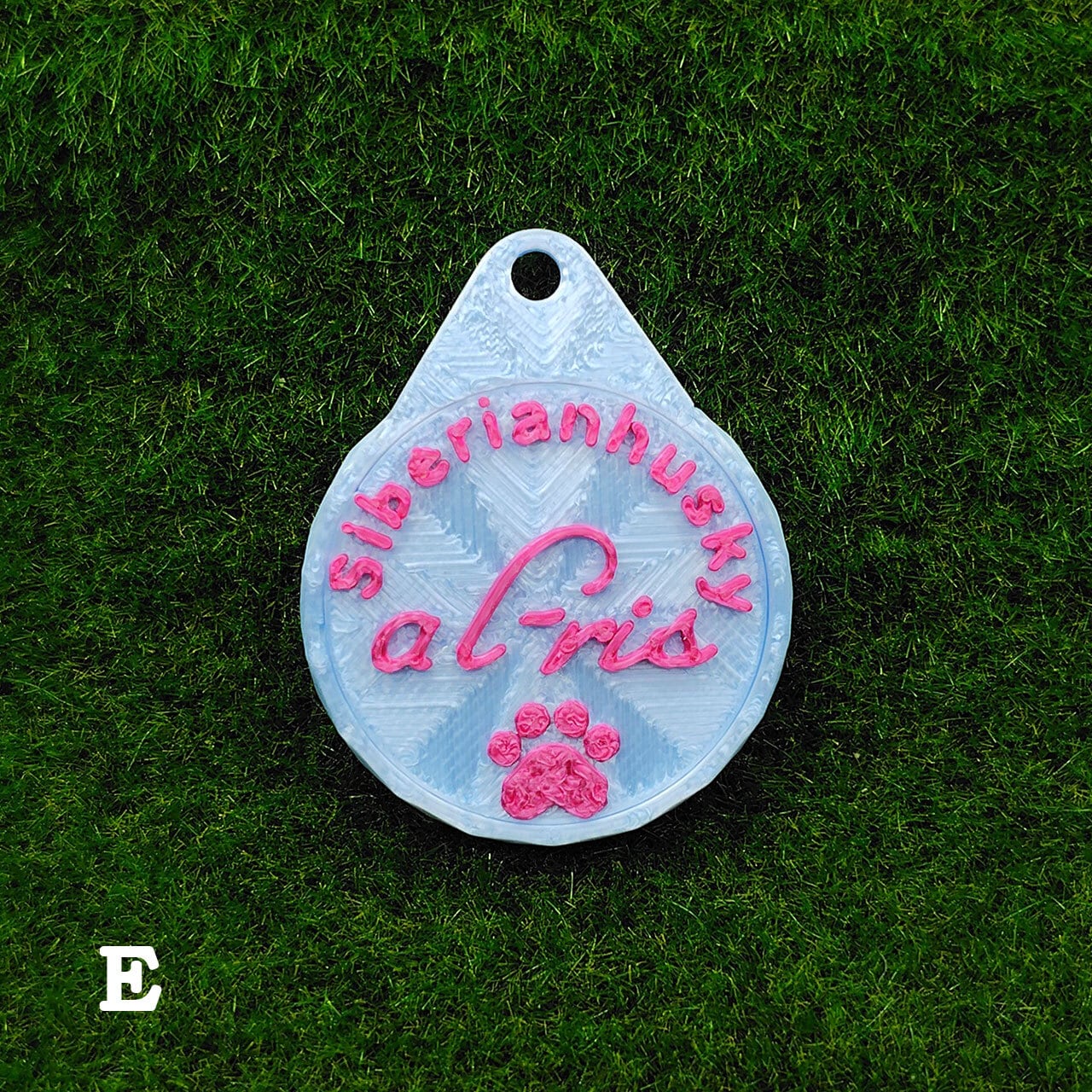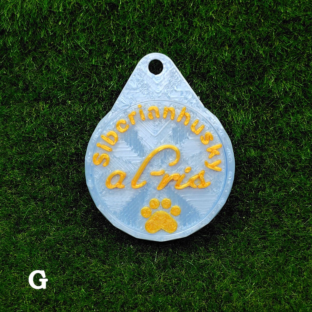 表面に犬種・おなまえ・足跡マーク、裏面にオーナー名・連絡先などが入ります。