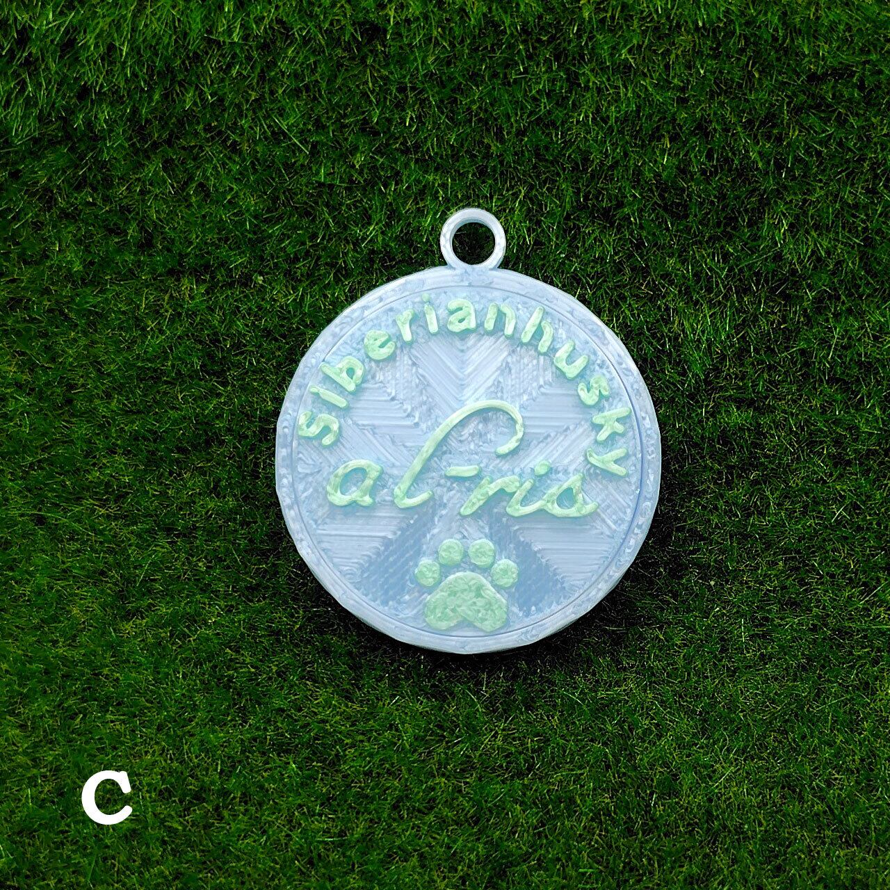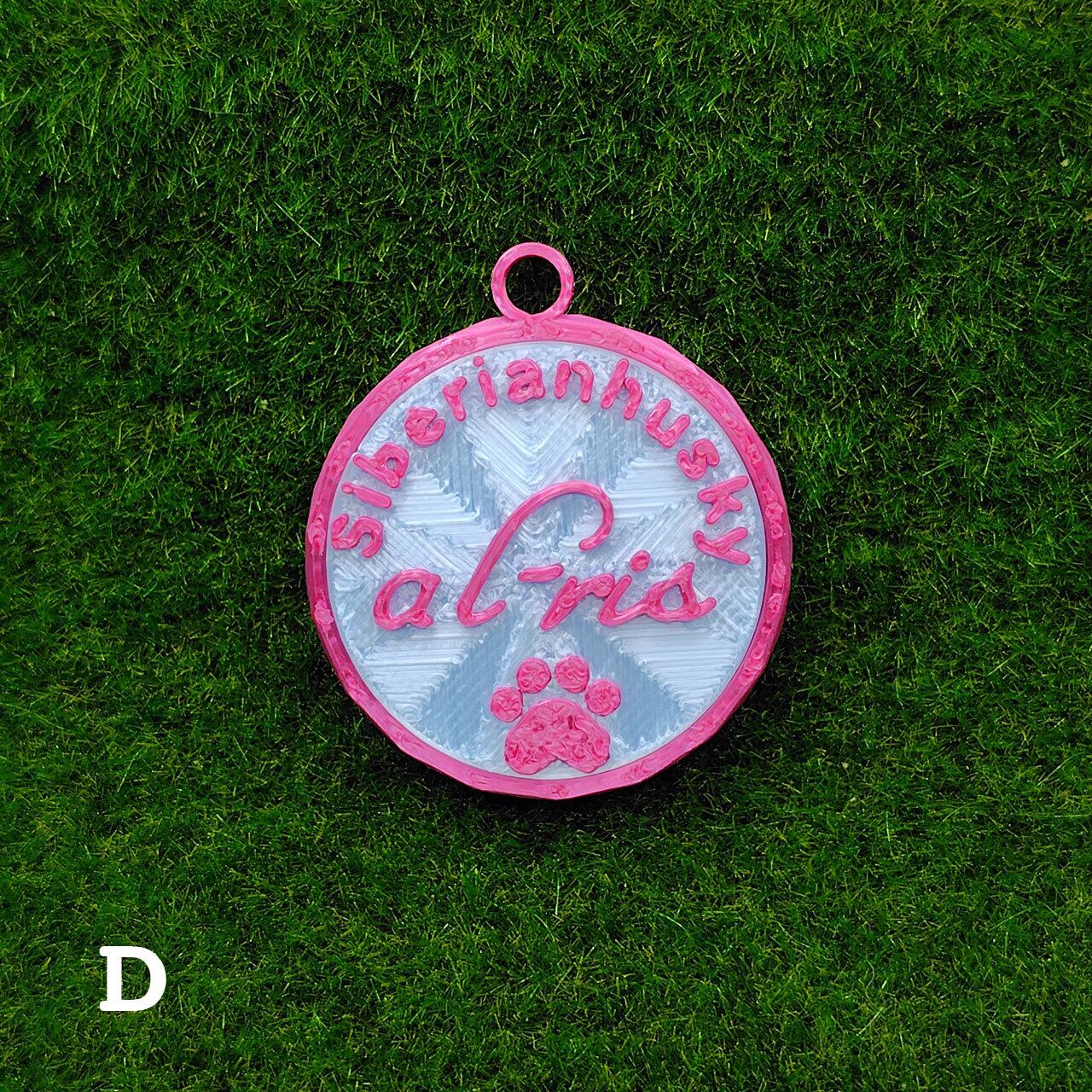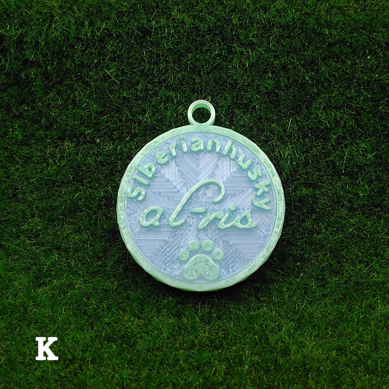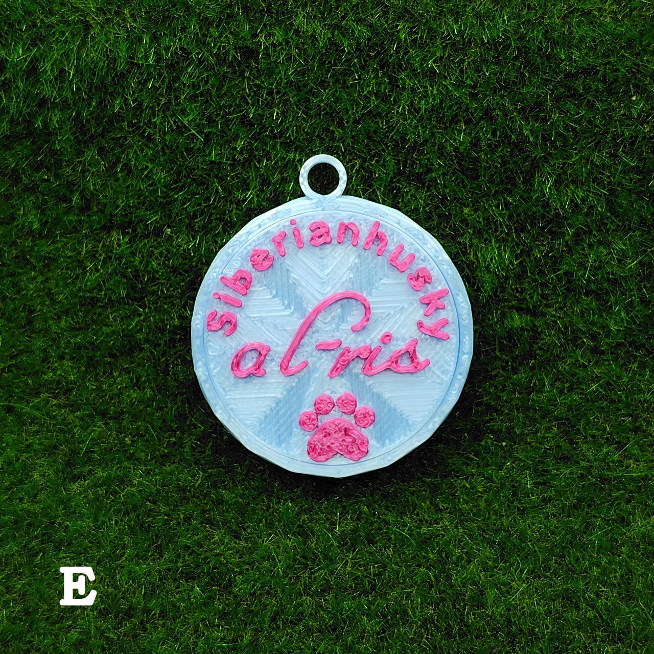 表面に犬種・おなまえ・足跡マーク、裏面にオーナー名・連絡先などが入ります。