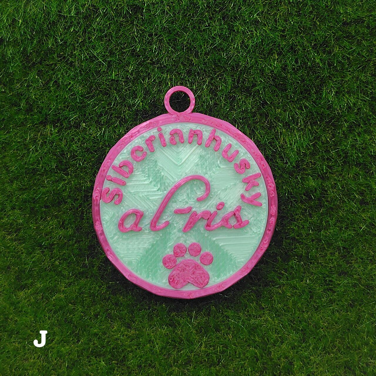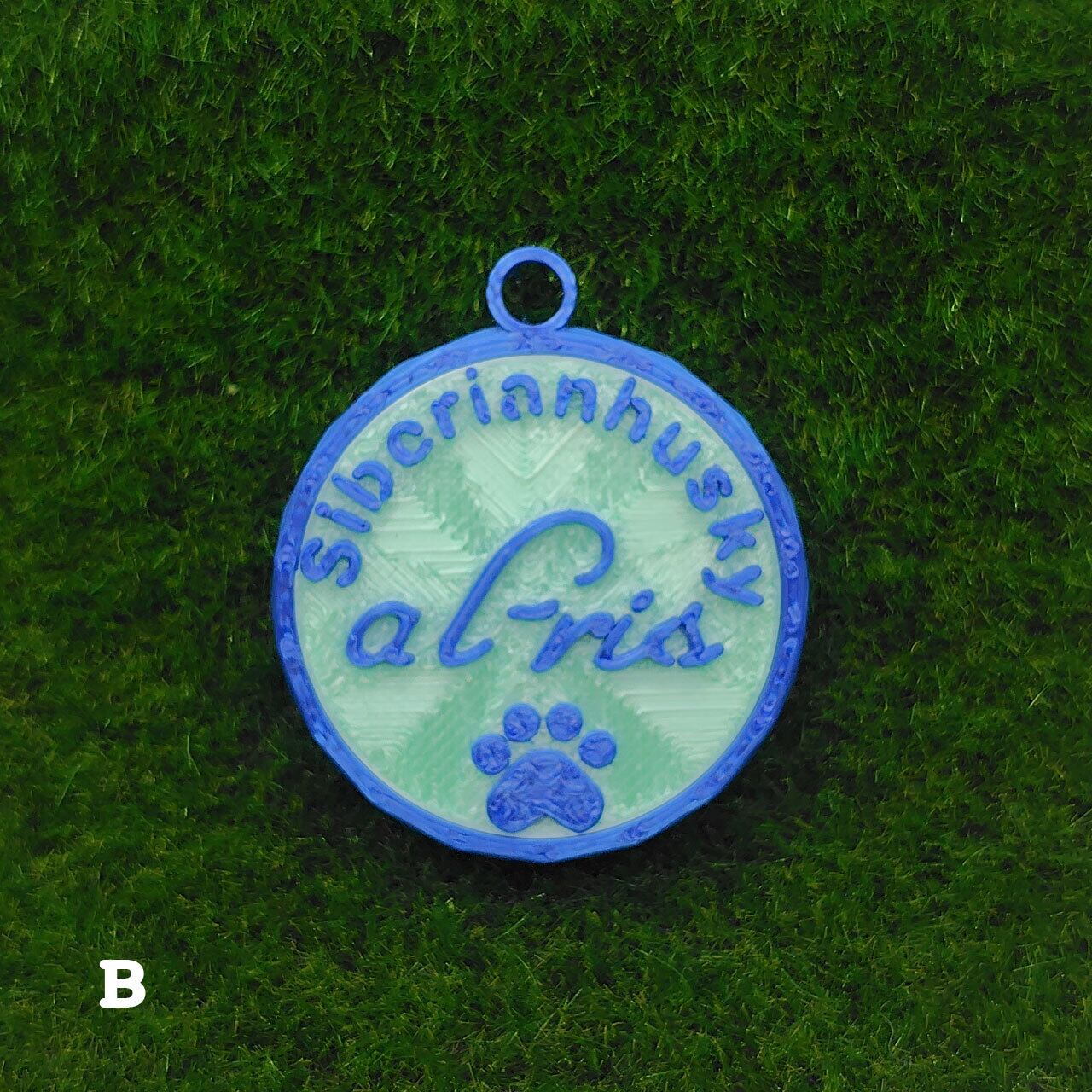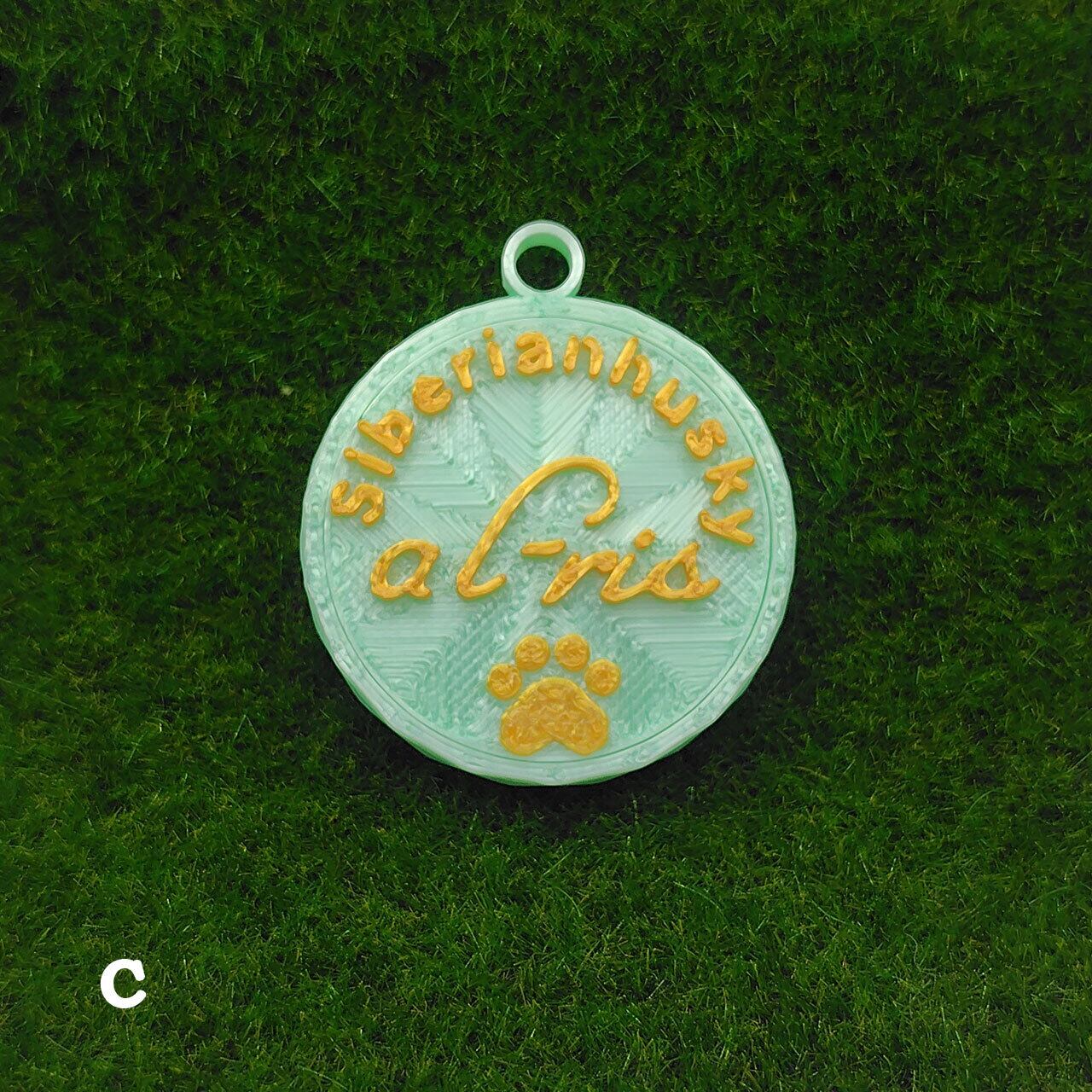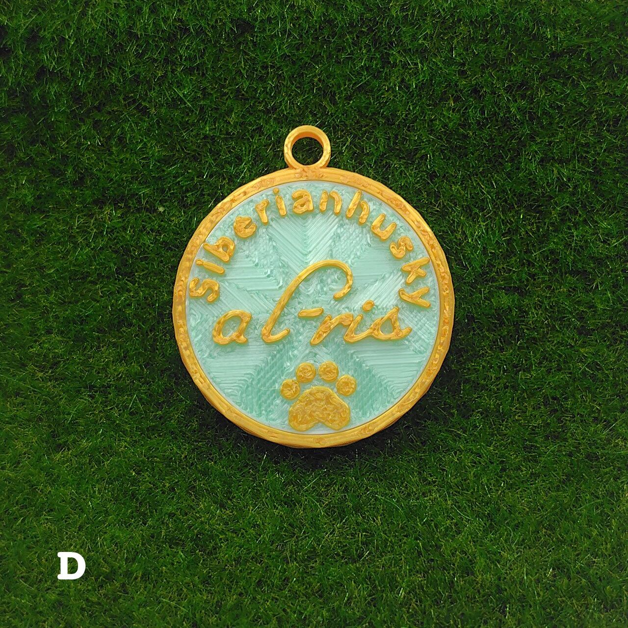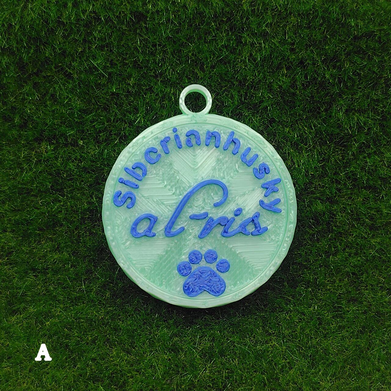 表面に犬種・おなまえ・足跡マーク、裏面にオーナー名・連絡先などが入ります。