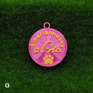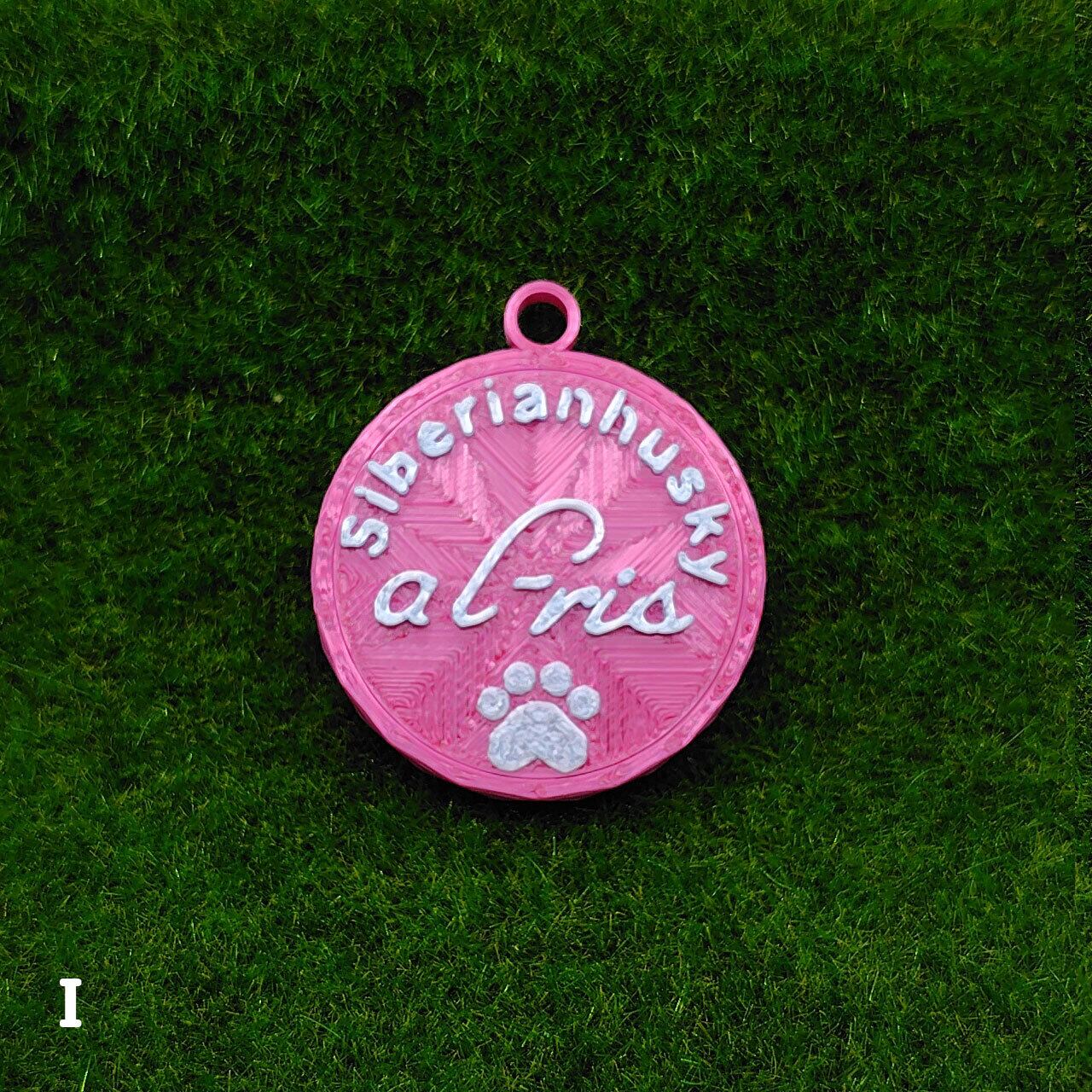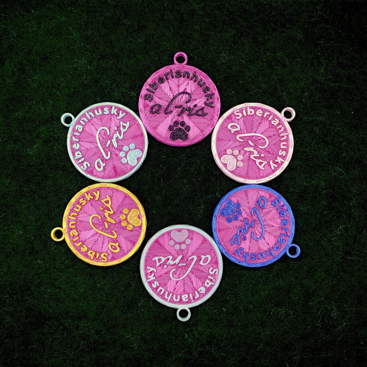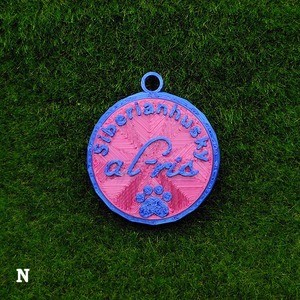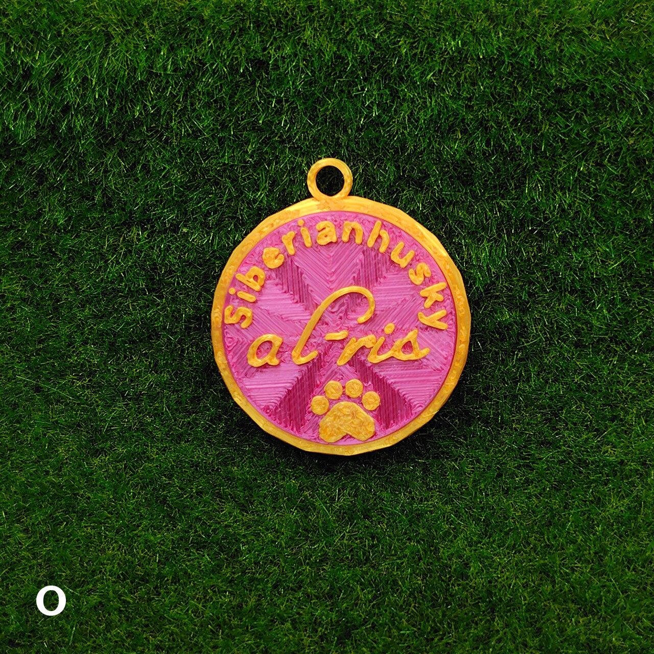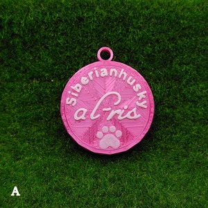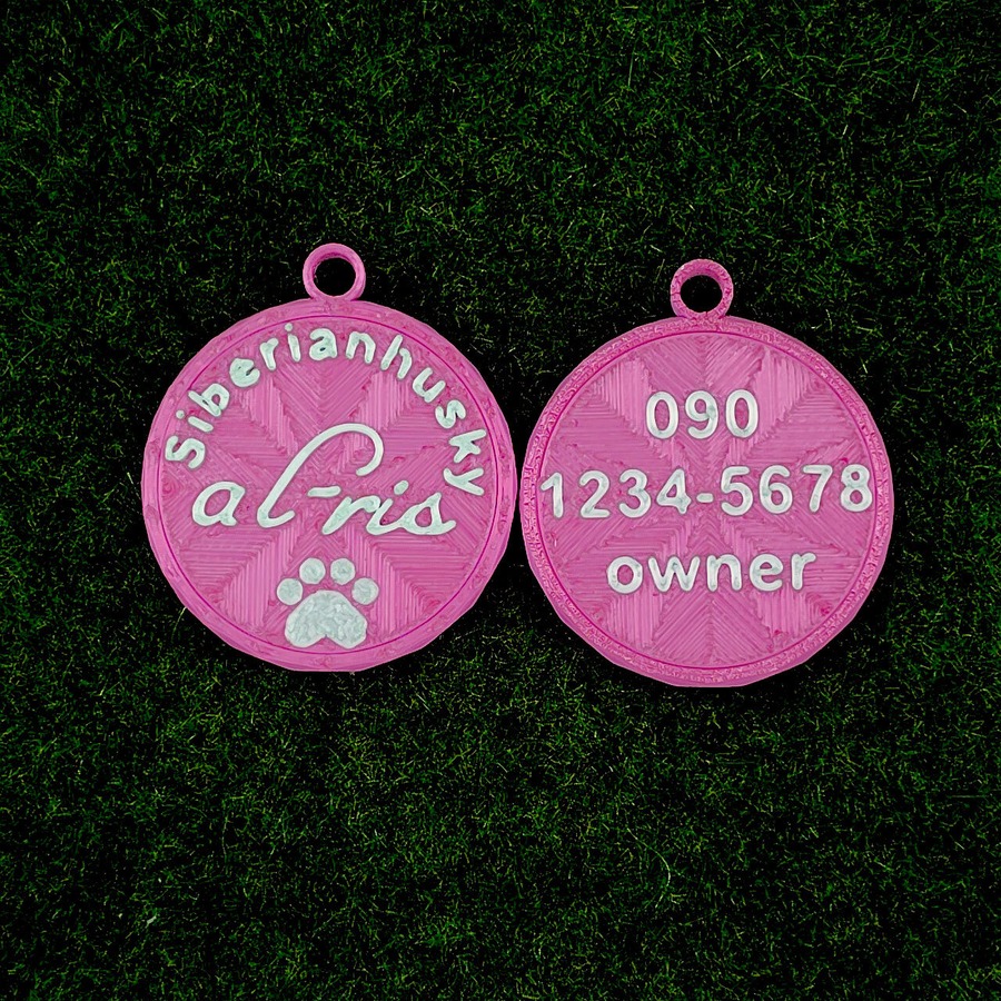表面に犬種・おなまえ・足跡マーク、裏面にオーナー名・連絡先などが入ります。