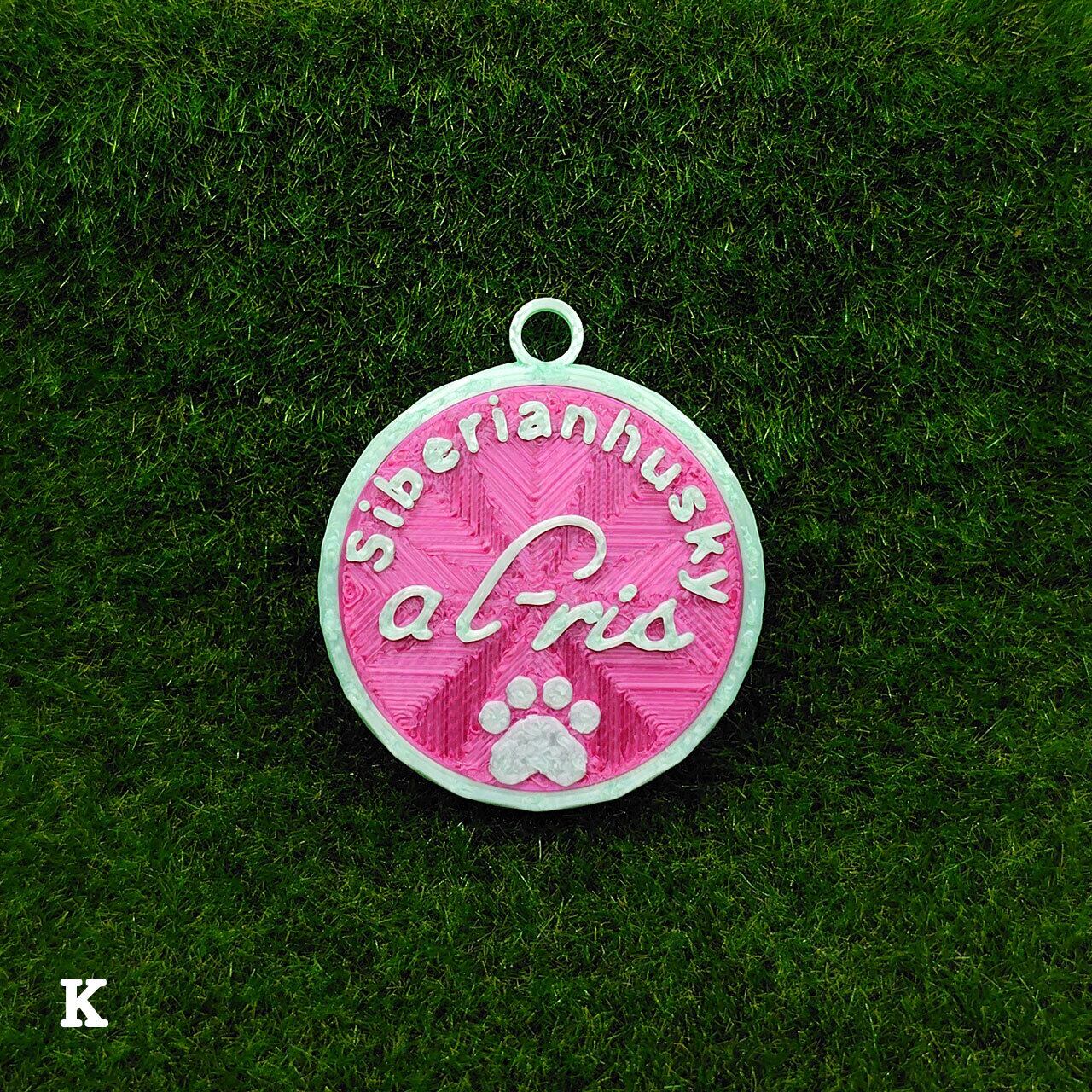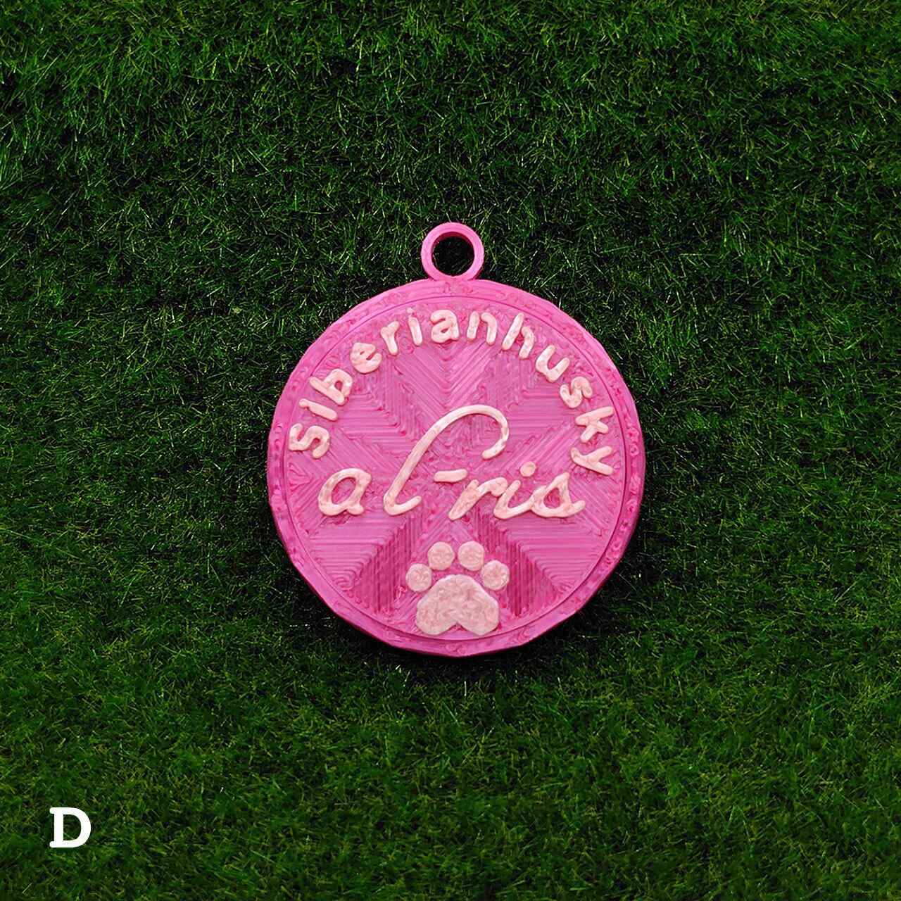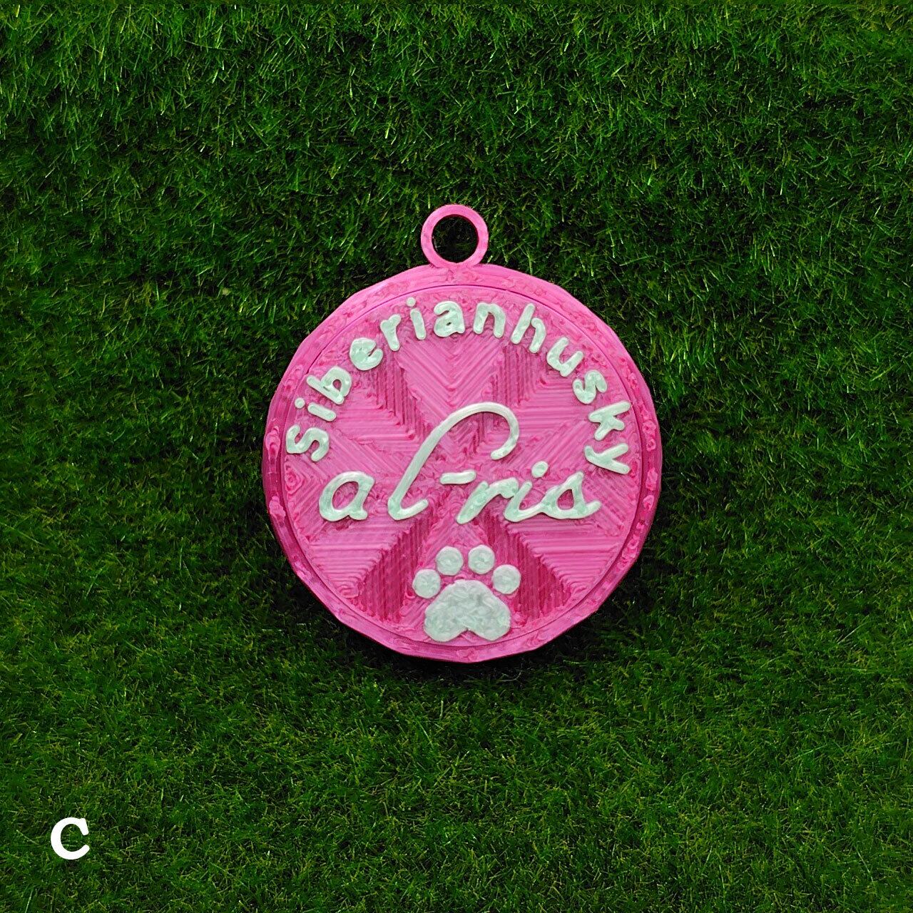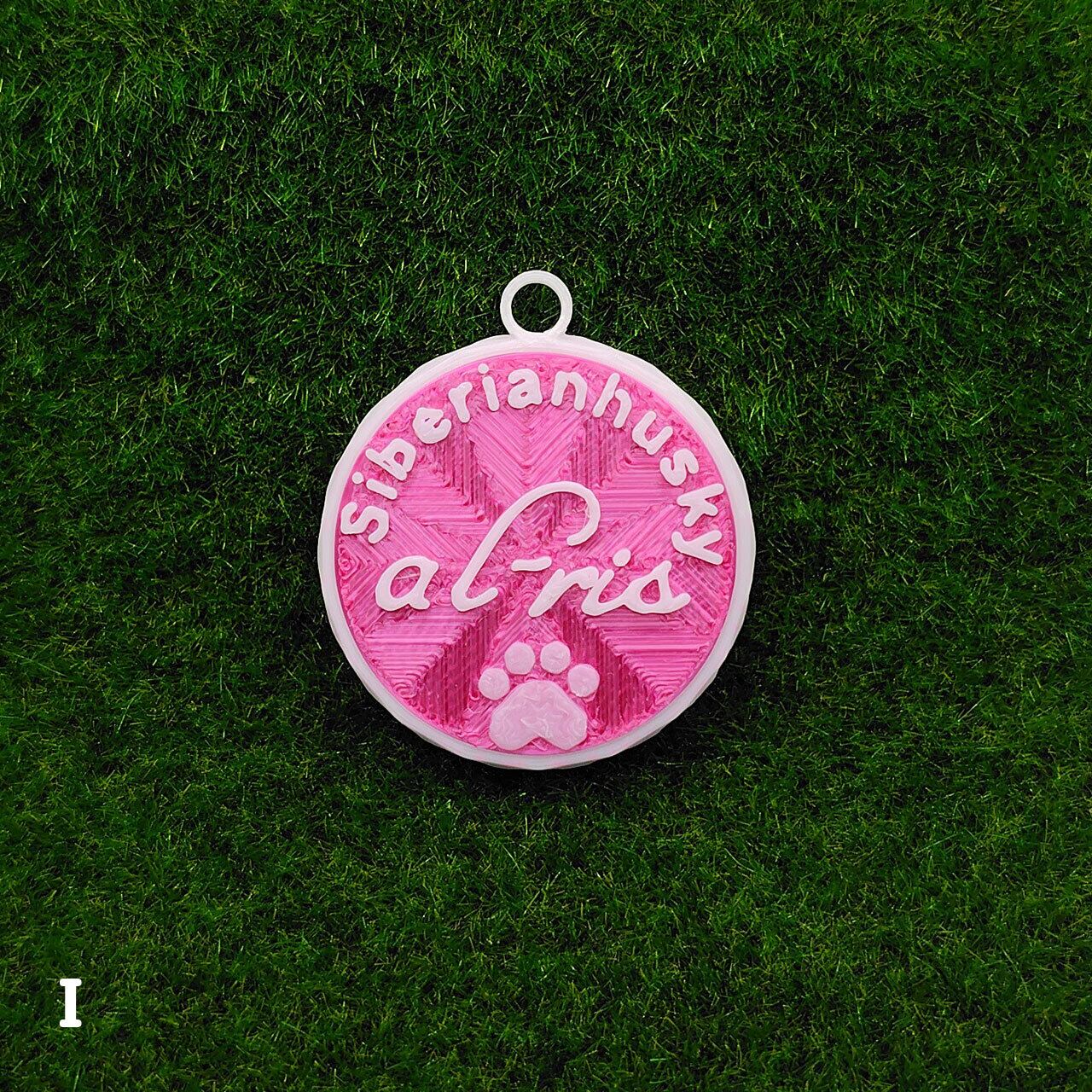 表面に犬種・おなまえ・足跡マーク、裏面にオーナー名・連絡先などが入ります。
