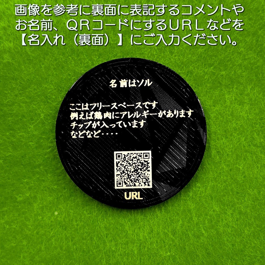 裏面はフリースペースとしてご利用いただけます。電話番号やお名前を直接彫刻するほか、電話番号をQRコードにして刻印することも可能です。迷子札として保護してくださった方へのお願いメッセージや、プレゼント用のメッセージなど、用途に合わせて自由にカスタマイズいただけます。