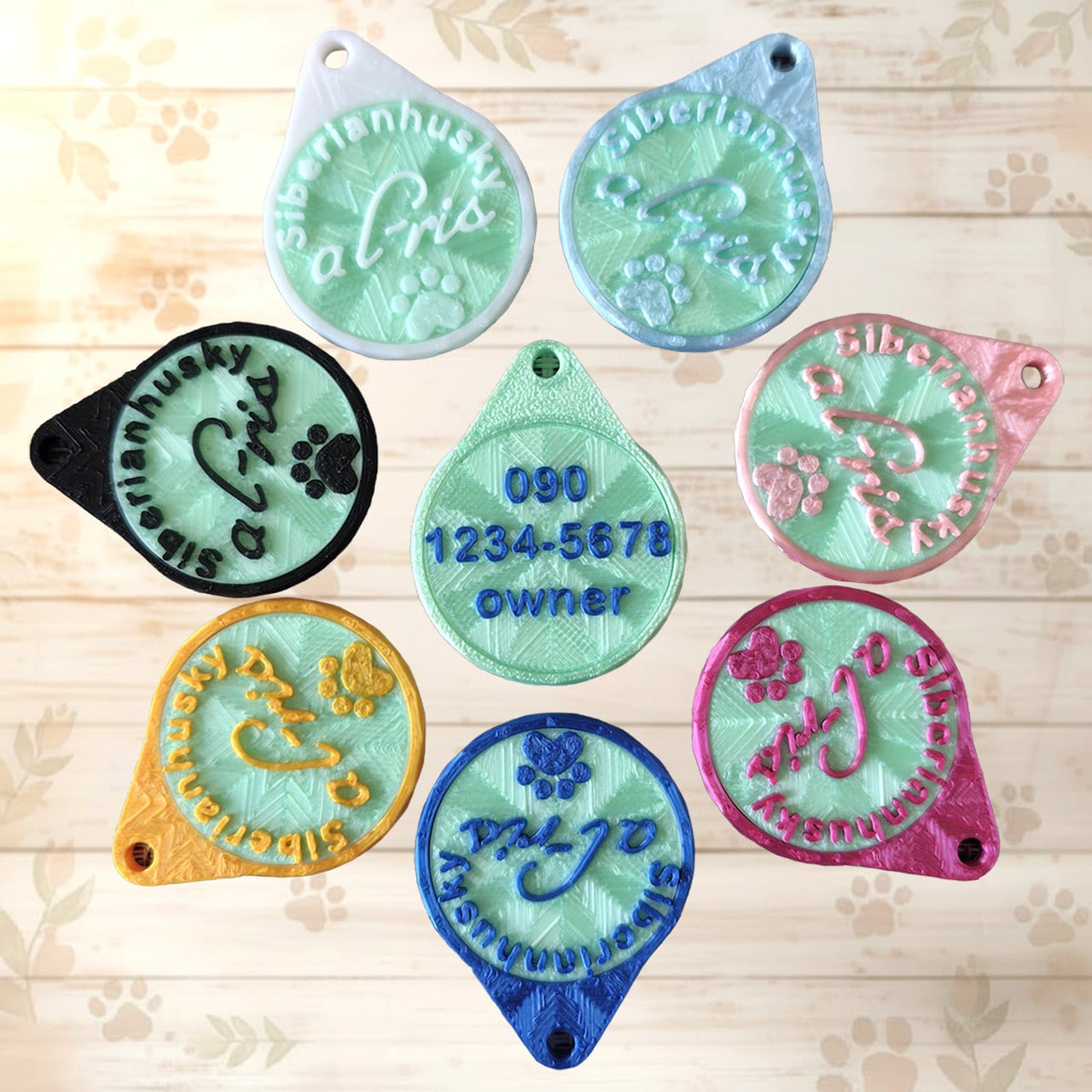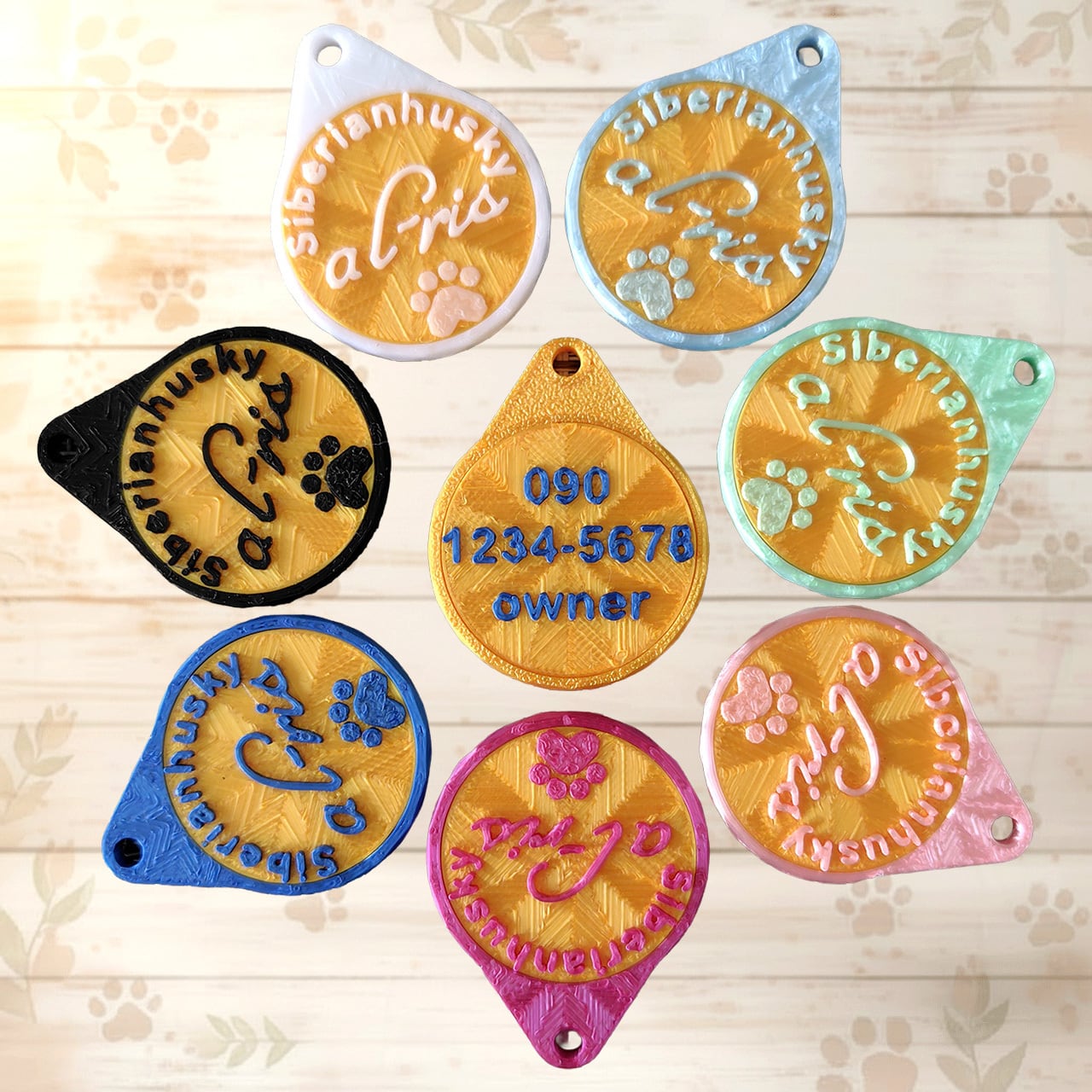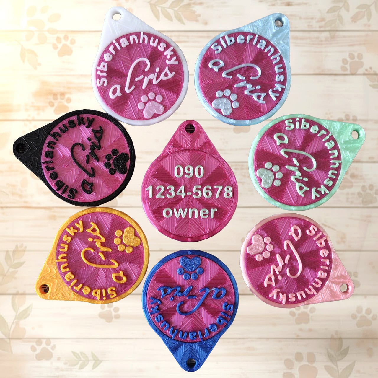 表面に犬種・おなまえ・足跡マーク、裏面にオーナー名・連絡先などが入ります。